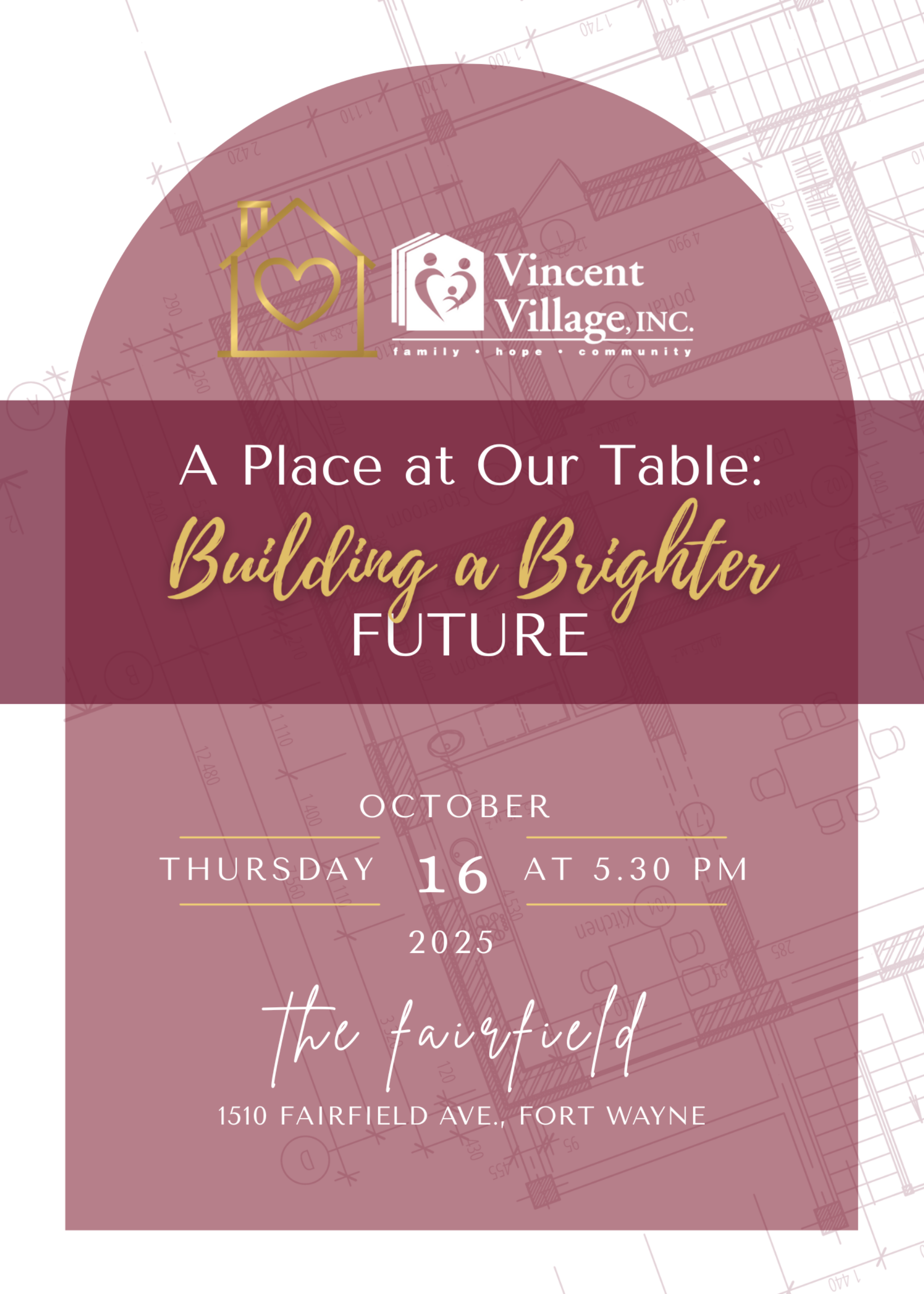 Be part of Vincent Village’s A Place at Our Table: Building a Brighter Future fundraiser on Thursday, October 16, 2025, at The Fairfield. Enjoy an inspiring evening of family-style dining, stories of transformation, a live auction, and more—all in support of families on their journey to stability and independence. Click on the invitation to purchase tickets.